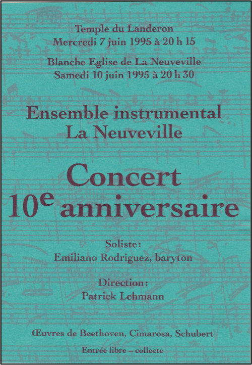 Après 10 ans d’existence, l’EIN rencontre le chef Patrick Lehmann, et prépare deux programmes pour célébrer une décennie de musique et d’amitié en 1995, avec en juin notamment…le Coriolan de Beethoven, et en décembre une myriade de solistes de la région.