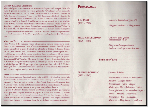 Les concerts célébrant le 20ème anniversaire ne font pas exception : l’affiche traverse les âges et les genres, avec le Concerto brandebourgeois n°2 de Bach et le Concerto pour violon en mi mineur de Mendelssohn, interprétés par la merveilleuse Denitsa Kazakova, ainsi que l’émouvante Histoire de Babar, composée par François Poulenc sur le texte pour petits et grands de Jean Brunhoff, lu pour l’occasion par la comédienne Mariane Finazzi.